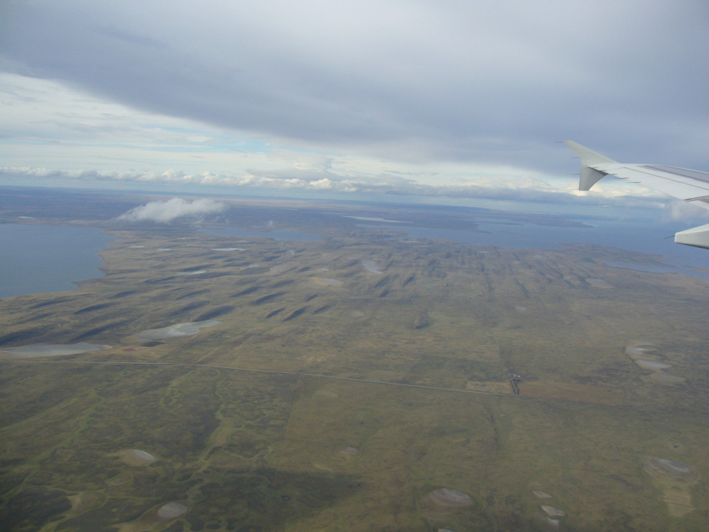 プンタアレーナス着陸直前の不思議な地形。右後方はマゼラン海峡