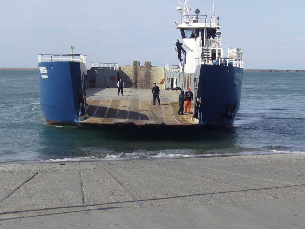 11:05フェリー乗場着。バスごとフェリーに乗りマゼラン海峡を渡る。このフェリーはまるで上陸用舟艇だ。船着場には岸壁など無く、コンクリートの斜面が海へと降りているだけ。そこにフェリーがやって来て、斜路を下ろして車を乗船させる。船底を擦らないのだろうか?