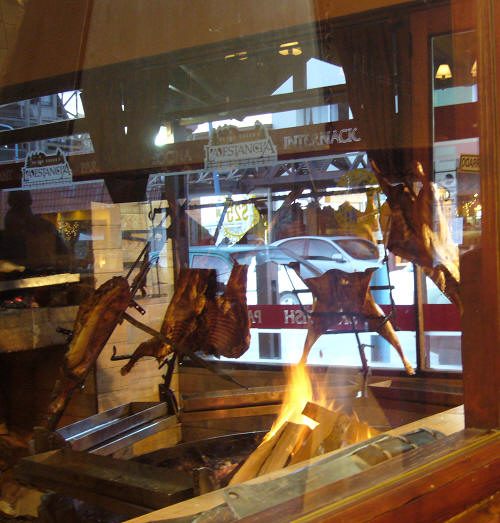 囲炉裏の回りに数頭の捌いた牛を手足をおっぴろげて炙り焼きしているのだが「ステーキ」と言うと、日本なら一家族分のローストビーフぐらいのデカイ塊りを切ってくれる(下中央)。当然何度でもお替わりできる。豚も鶏(下右)もソーセージも豊富。ソーセージは直径3センチぐらいのぶっとい奴だ。他にセルフ・サービス・コーナーがあって、五ケース×二段程度が肉気たっぷりのパスタ類で、その右手に野菜のボウルがいくつか。……もっとも、アルゼンチンでは都市部以外でホステルに泊まると毎晩のようにアサード・パーティーをA$10程度で開いてくれるというから、これでも高いのだ。