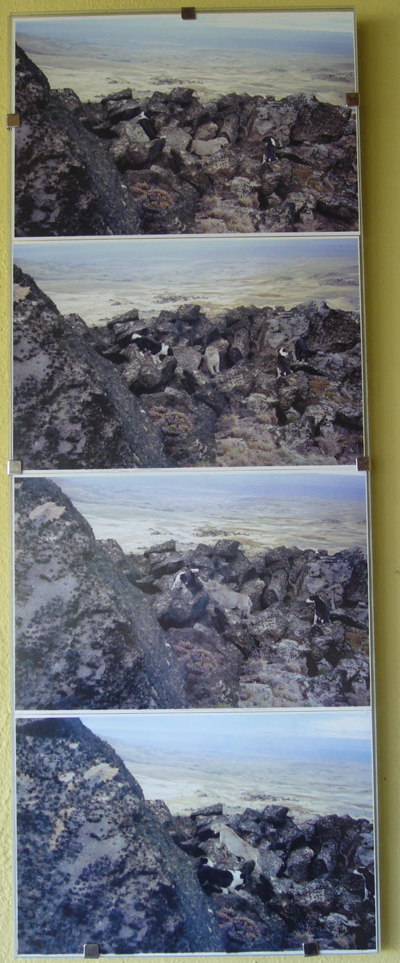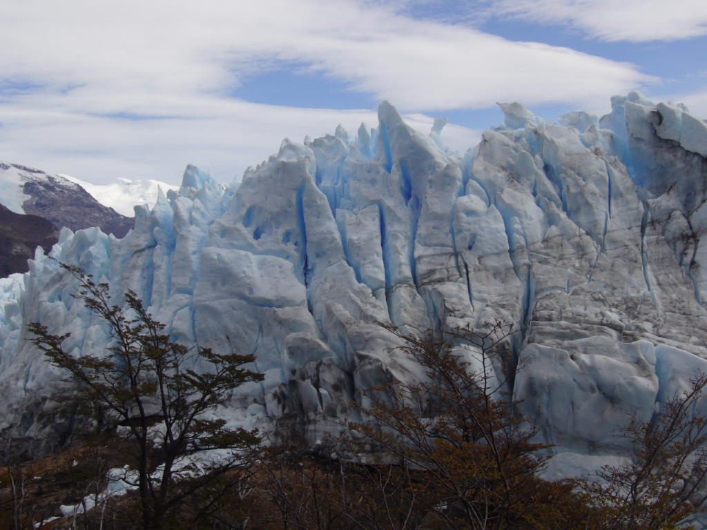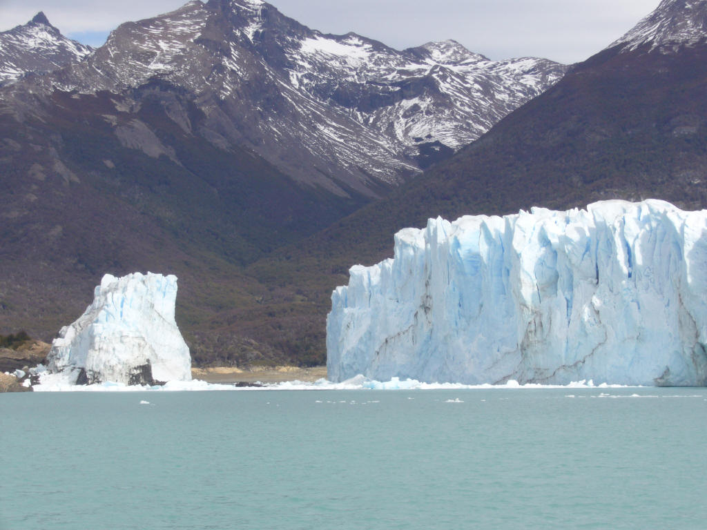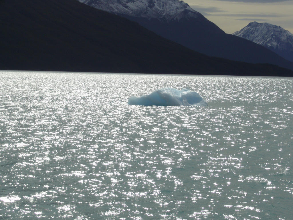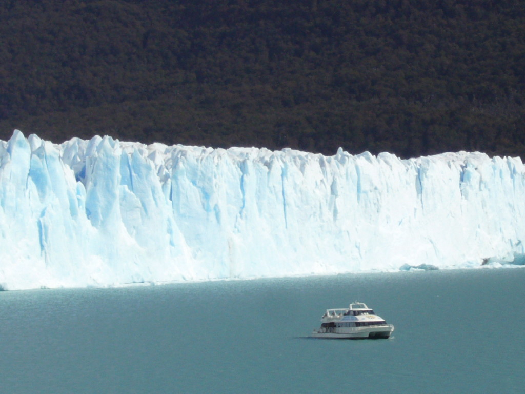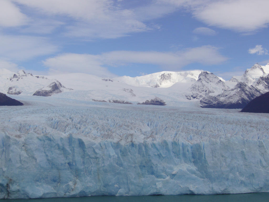 朝からペリト・モレノ氷河ツアーに出発する。 氷河はカラファテからはかなり遠く、途中パタゴニアの野生動物や景観を楽しみながら大きく迂回して氷河に接近する。カラファテ──町と同じ名前の花、水鳥cauquen、aguila、カランチョもしくはカラカラ。こいつはしようのない男の代名詞とされている。メスからメスへとうろついて生きるようだ。ダチョウChoique、冬場にはヒョウを見かける事も有るという。 氷河は、二つの湖の間を繋ぐ谷が狭まった位置に押し出している。上流から岸沿いの道を右回りに進んでいくとやがて対岸遠方に氷河が見えてくる。氷河末端は流石に凄い。上流からこれ程の氷塊が押し寄せて来ているのだと思って見ると迫力が違う。スイスでも上からは見ているはずだが、こういう見方は初めてだ。 幸運なことに展望テラスから真正面の氷河末端崩落をムービーで撮ることができた。 画像では大きさが良く分らないが、この氷河端の高さは20〜30メートルある。このページ下部の三段になった写真の左上のをクリックしてクルーザーと較べると大きさが類推できる。このクルーザーは船内に横十数列・縦七列程度の座席がある大きな船だ。喫水から最上部まで8m程度ある。 音声を出して、観光客の歓声を聞いてください。