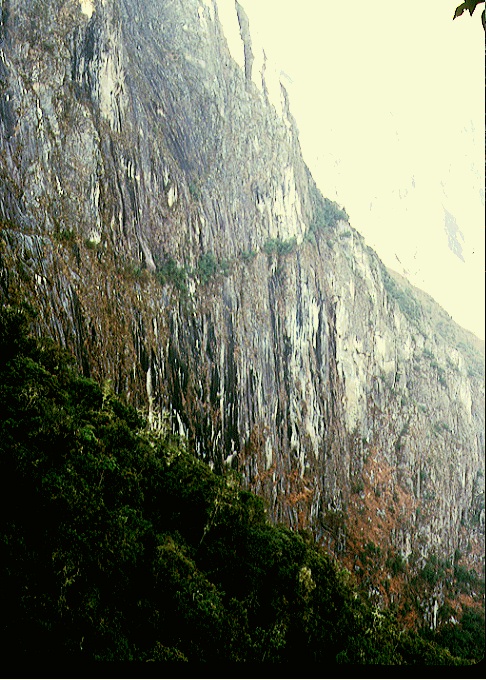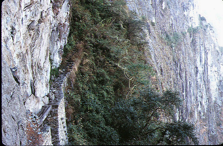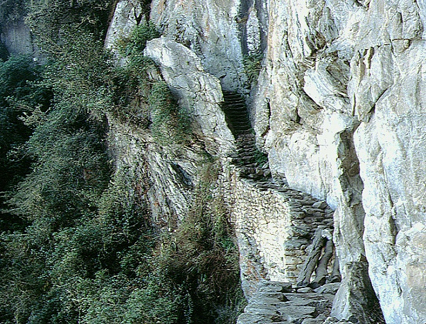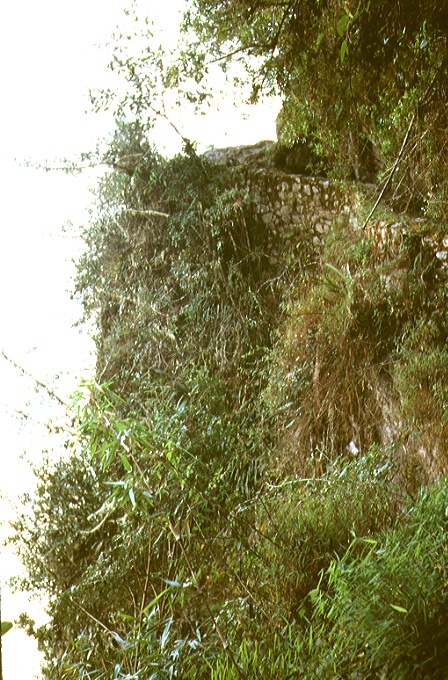 マチュピチュから裏手の墓地を抜けると、崖の上、川を遥か下に見下ろす高所に裏道が続いている。 裏道は崖の上 数百m下に、ウルバンバ川 裏道の先にある落とし橋は 敵を食い止めるためのもの? 橋を渡り、道を振り返る 橋の先の道は、巨大な崖を横切って 続いているのか?